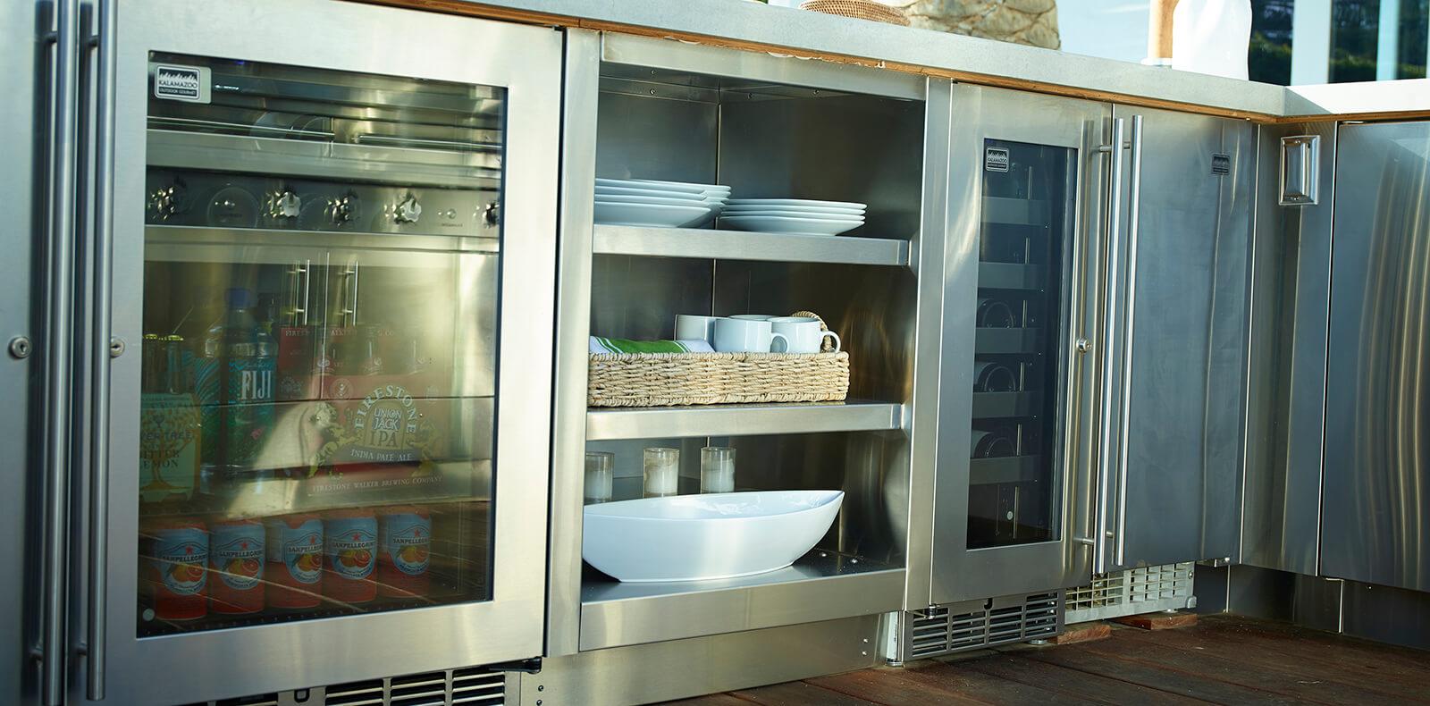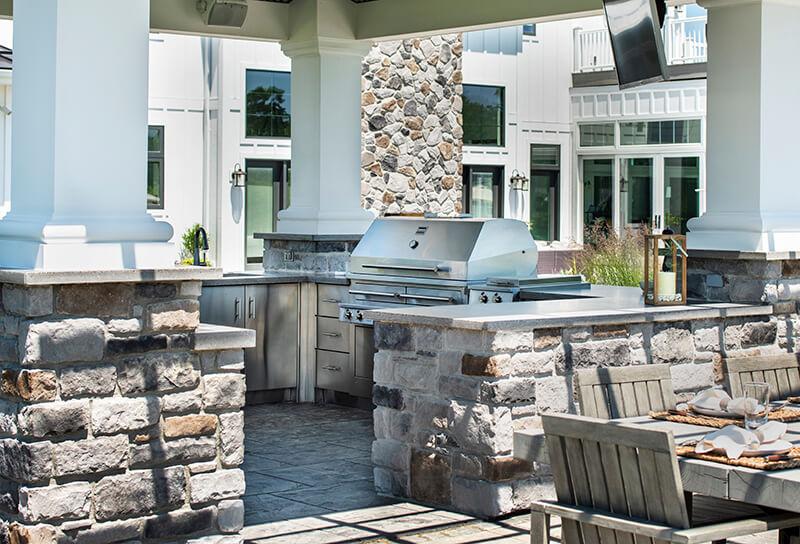 One of the most common challenges when planning an outdoor kitchen is balancing space constraints with enough usable storage and prep areas. Large kitchens functioning independently from the indoors require more storage and counter space for prep and serving. For smaller kitchen layouts, determine the essentials necessary for convenience. Reserve space for utensils, accessories and cleaning supplies, and consider adding a cart for additional surface area.